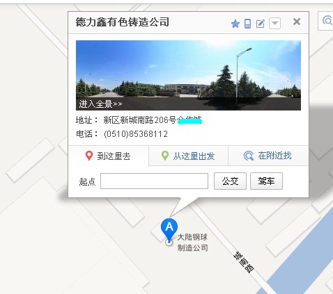 很多时候作为我们无锡本地人,可能都不知道无锡市新区新城南路206号在哪,对于外地的客户那就更不清楚了,现在我们就来给大家讲讲,新城南路206号是我们有色的地址。我们有色专业从事各种铜、铝合金铸造、有重力制造、砂型铸造、低压铸造、高压铸造。我们的产品有各种管接件、阀门、导体等。很多在网络上寻找到我们有色的外地客户,在到我司实地考察的过程中,发现了,百度地图真的很强大,只需把我们有色的地址输在目的地里面,把客户现在的地址输入在出发地里面,一条捷径里面呈现在大家面前,我们的潜在客户不再为找不到我们有色的地址而发愁。客户有意向要到我们有色参观,请提前电话与我们的在线客服取得联系0510-85368112。